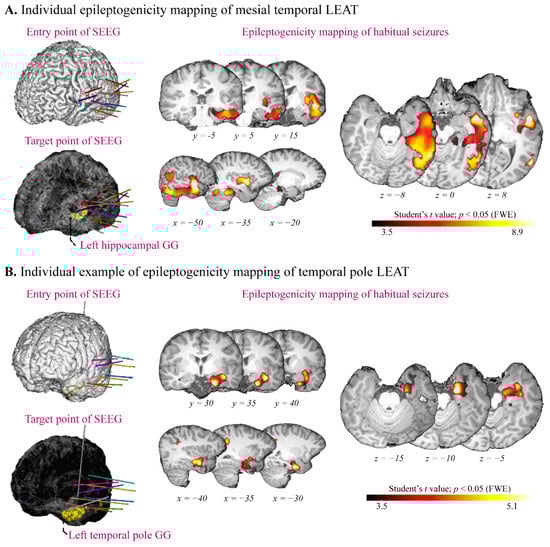 Epileptogenicity mapping of temporal lobe long-term epilepsy-associated tumors (LEAT). Representation of The SEEG implantation strategy, lesion location (left panel), and the epileptogenicity mapping (right panel) of (A) patient 64, with hippocampal ganglioglioma (GG) and (B) Patient 70, with temporal pole GG. FWE: family-wise error.