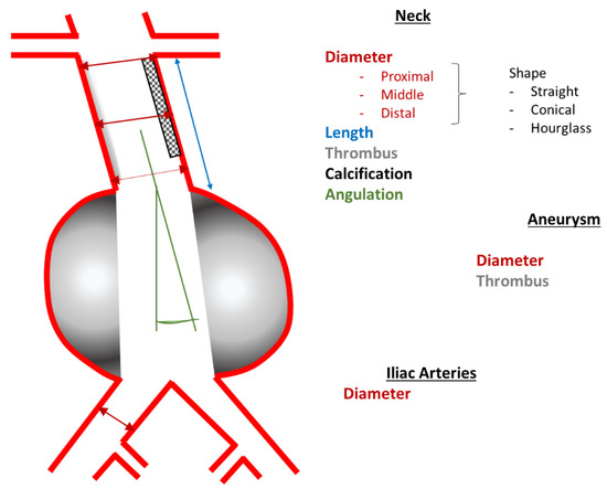 Careful preoperative planning before EVAR is essential in order to achieve optimal results and special consideration has to be given to the proximal and distal landing zones [5,6,7,8]. In addition to patient specific factors, such as age and comorbidities, the evaluation of the proximal landing zone, i.e., the aneurysm neck, is the main criterium for choosing the type of aneurysm repair that can be offered. Mainly the diameter, length, shape, and angulation but also the presence of thrombus and/or calcification in the aneurysm neck determine whether infrarenal repair by means of EVAR is possible, more complex endovascular reconstructions (e.g., fenestrated/branched EVAR [FEVAR/BEVAR]) are required or whether open surgery (OSR) is the better alternative.