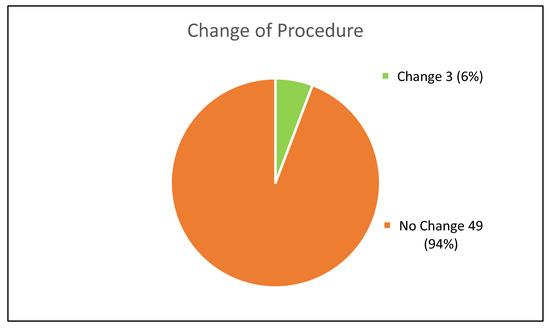 There has been a procedural change in three cases (Figure 3). In one case, the planned treatment changed from EVAR to FEVAR because the neck shortened from 24 mm to 0 mm. In the second case, it was a “no neck” AAA from the beginning, so that FEVAR was planned, but it changed from two fenestrations to three. In the third case, an EVAR would have been possible initially, but due to an increase in neck thrombus FEVAR was deemed more adequate later on.