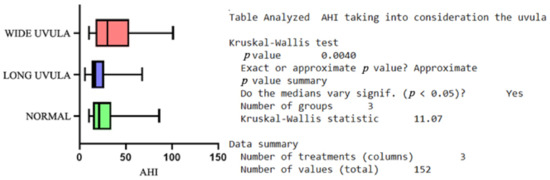 In order to analyze more than two subgroups, we applied the nonparametric Kruskal-Wallis test; therefore, by comparing the subgroups with different types of tonsillar morphology, we recorded no statistically significant difference. The same situation was encountered when comparing the subgroups with different Webbing classes. However, we discovered a p = 0.0025 when analyzing the statistical correlation between the AHI and the different types of uvulae, Figure 1. Although the initial observations targeted a positive correlation between the AHI and the Mallampati classification and also the different types of tongue morphology, the Kruskal-Wallis test excluded this.
