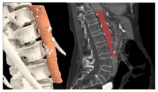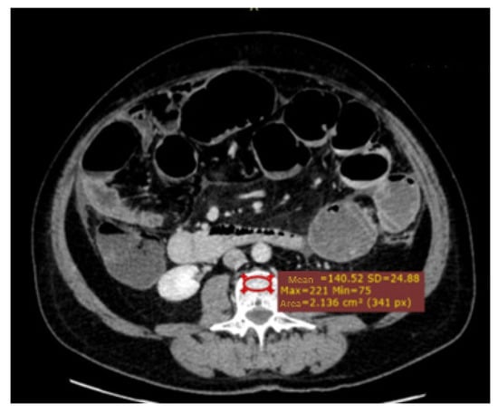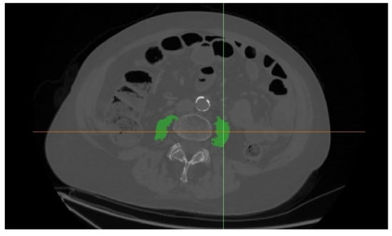Sarcopenia assessment was defined as the bilateral psoas muscles area normalized for the patient’s height (cm2/m2) at the level of L3. The area was contoured semi-automatically with region growth algorithms and (−29,150 HU) limits. The segmented areas were manually corrected if necessary (Figure 2).