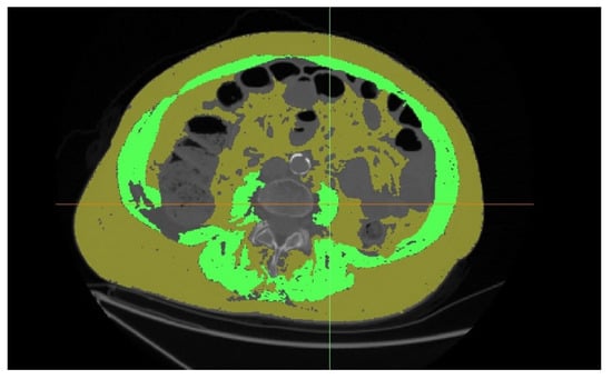 The sarcopenic obesity parameter was defined as the total cross-sectional visceral and subcutaneous fat tissue area divided by the total cross-sectional muscle tissue area on a single axial slice at L3 (Figure 3). Following the approach from other studies, region growth algorithms were used with the (−150, 50 HU) range for visceral fat and (−190, 30 HU) for subcutaneous fat [].