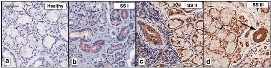 Representative serial 3 μm sections of healthy and pSS formalin-fixed, paraffin-embedded minor SG (MSG) tissues were rehydrated and deparaffinized in graded alcohol. (1 h in 70% ethanol supplemented with 0.25% NH3 and immersion in 50% ethanol for 10 min). The slides were washed in phosphate-buffered saline (PBS) (pH 7.6 3 × 10 min) and immersed in EDTA buffer (0.01 M, pH 8.0) for 20 min to unmask antigens. The immunolabeling was performed by blocking the endogenous peroxidase by treatment with 3% hydrogen peroxide solution in water for 10 min at room temperature (RT) and carrying out a preincubation in non-immune donkey serum (Dako LSAB Kit, Dako, CA, USA). Then, the slides were incubated overnight at 4 °C with primary Abs. The relative secondary Abs (Santa Cruz Biotechnology, Dallas, TX, USA) diluted 1:200 in PBS for 1 h at RT followed by the streptavidin-peroxidase complex (Vector Laboratories, Newark, CA, USA) for 1 h at RT were applied to the sections. Then, 3,3-diaminobenzidine tetrahydrochloride (DAB) was used as chromogen (Vector Laboratories), and hematoxylin (Merck Eurolab, Dietikon, Switzerland) for counterstaining. Negative controls of the immunoreactions were performed by replacing the primary Ab with donkey serum. After the addition of the secondary Ab, no specific immunostaining was observed in the negative controls.