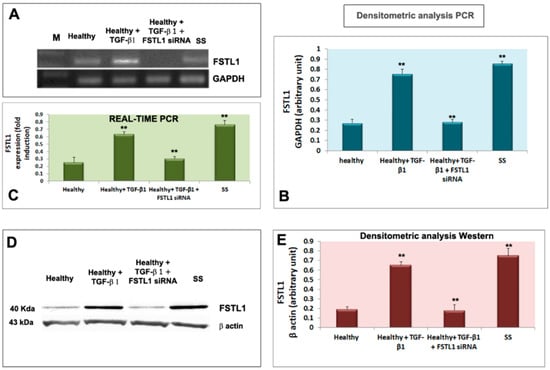 Healthy SGEC were treated with 10 ng/mL of TGF-β1 for 24 and 48 h. Figure 2A,B, shows that the TGF-β1 treatment resulted in the upregulation of FSTL1 mRNA expression (detected after a 24-h treatment) (p < 0.01) in comparison with untreated cells. These results were confirmed by Real-Time PCR as reported in Figure 2C. Regarding the FSTL1 protein expression, it significantly increased in the healthy SGEC were significantly increased after a 48-h treatment with TGF-β1 (p < 0.01) (Figure 2D,E). As a positive control, FSTL1 was also analyzed directly in pSS SGEC, confirming an overexpression of the FSTL1 gene and protein (Figure 2A–E).