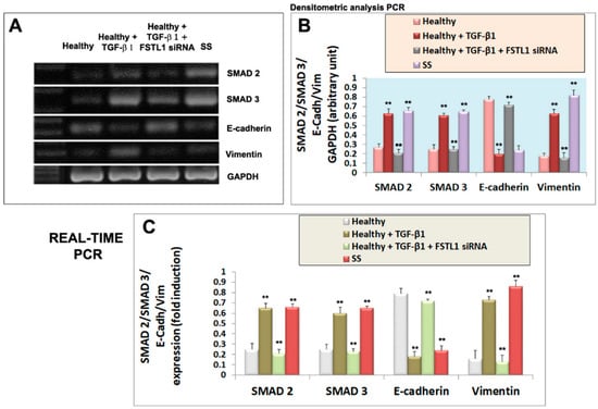 Effect of FSTL1 gene silencing on E-cadherin, vimentin, SMAD2 and SMAD3 gene expression evaluated by RT-PCR (A,B) and quantitative Real-Time PRC (C). (A): E-cadherin, vimentin, SMAD2, and SMAD3 gene expression were determined by RT-PCR in healthy SGEC (control, lane 1) cultured for 24 h with 10 ng/mL of TGF-β1 in which FSTL1 gene silencing was induced (lanes 2, 3). SS SGEC mRNA was used as a positive control (lane 4). (B) represent the densitometric analysis. Real-time PCR conducted on SGEC submitted to some treatments was shown in (C). GAPDH (A,B) and β-2-microglobulin (C) were used as reference genes for mRNA analyses. Values represent the mean ± SE of three independent experiments, with ** = p < 0.01.