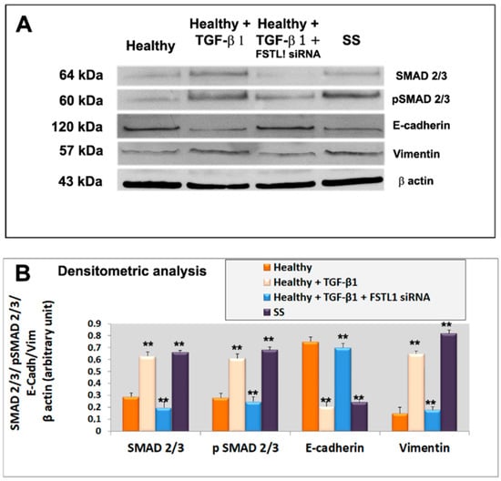 We next investigated whether diminished epithelial cell activation in TGF-β1-treated healthy SGEC after the FSTL1 gene knockdown, altered the expression of mesenchymal and epithelial markers, often used in the evaluation of EMT activation. We reasoned that TGF-β1-treated glandular epithelial cells may underwent an EMT program activation through FSTL1 overexpression which may influence epithelial and mesenchymal factors modulation. Healthy SGEC were treated with 10 ng/mL of TGF-β1 after the transfection with FSTL1 siRNA, and the expression of the gene biomarkers of EMT was examined by RT-PCR and quantitative Real-time PCR. As shown in Figure 4A–C, TGF-β1-treated SGEC shows reduced E-cadherin gene expression accompanied by upregulation of gene mesenchymal marker vimentin, but the FSTL1 gene expression inhibition significantly reverses the situation by blocking mesenchymal gene transcription (p < 0.01) (Figure 4A–C). We also detected these markers’ expression at protein’s levels. By Western blot analysis, we found that the level of EMT protein markers significantly changed following 10 ng/mL of TGF-β1 in cells transfected with FSTL1 siRNA for 48 h (Figure 5A,B). In fact, blocking the effect of TGF-β1-dependent release of FSTL1 by the gene silencing technique, the expression of E-cadherin was increased, and vimentin was decreased in a significant manner (p < 0.01) (Figure 5A,B). As control in these experiments, we also used SS SGEC treated with FSTL1 siRNA in vitro, which confirm genes and proteins results obtained in TGF-β1-trated healthy SGEC, demonstrating that FSTL1 could promote EMT in SS SGEC.