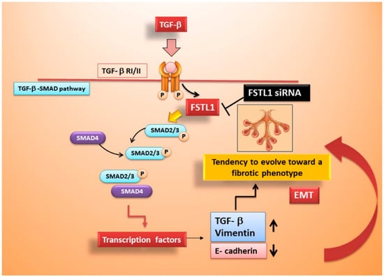 Converging lines of evidence have suggested an intrigant key role of FSTL1 in epithelial-mesenchymal transition (EMT) [7], a dynamic and reversible process in which cells gradually lose their epithelial phenotype and transform into a mesenchymal phenotype; moreover, sustained activation of EMT, in the context of the response to injury, promotes inflammation, triggering the fibrotic pathology of multiple organs [8,9]. Interesting studies have underlined as FSTL1 promotes EMT in concert with TGF-β1 [10,11]. Indeed, TGF-β1 regulates epithelial injury, myofibroblasts proliferation and differentiation, collagen production, and deposition. For this reason, it is indicated as a “master switch” in the initiation of the cascade of events that characterizes the EMT-dependent organ fibrosis [12,13,14,15].