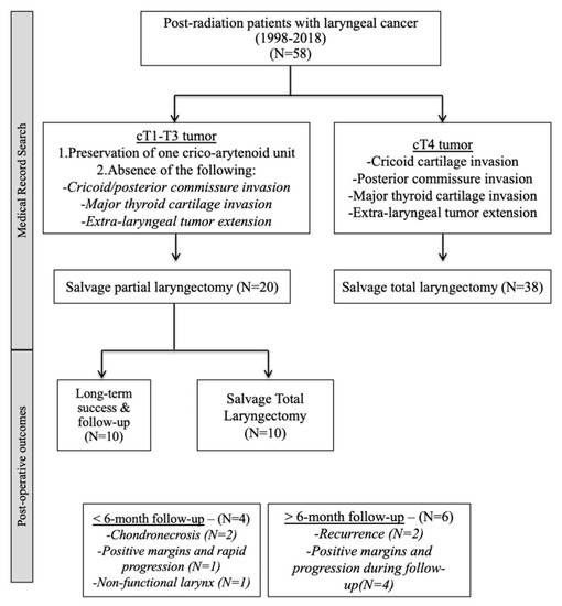 - Shapira, U.; Warshavsky, A.; Muhanna, N.; Oestreicher-Kedem, Y.; Nachalon, Y.; Ungar, O.J.; Safadi, A.; Carmel Neiderman, N.N.; Horowitz, G. Laryngectomy-free survival after salvage partial laryngectomy: A systematic review and meta-analysis. Eur. Arch. Otorhinolaryngol. 2022, 279, 3021–3027. [Google Scholar] [CrossRef]