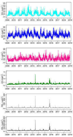 Trend of daily air pollutant concentrations in Singapore from 2009–2018.