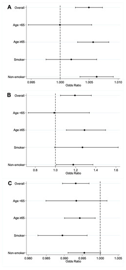Lower odds of AIS associated with SO2 (aOR 0.989, 95% CI 0.983–0.996, Figure 2C) among patients with AF compared to those without AF are also observed in those who smoke but not in those who do not smoke. Higher odds of AIS associated with O3 (aOR 1.006, 95% CI 1.003–1.009, Figure 2A) and CO (aOR 1.177, 95% CI 1.010–1.372, Figure 2B) among patients with AF compared to those without AF are also observed in those who do not smoke, but not in those who smoke. However, the aOR between AF and non-AF patients in those who smoke is not significantly different from the corresponding aOR in those who do not smoke for all the six pollutants (p-value of difference in aOR > 0.05). The modification effect of age group and smoking status on air pollutant and AIS is shown in Supplementary Table S1.