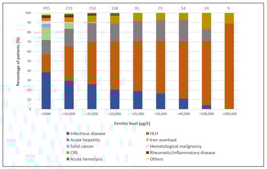 In this study, we have shown that hyperferritinemia is associated with a wide spectrum of conditions. However, three causes accounted for more than two-thirds of cases of major hyperferritinemia (i.e., TSF levels ≥ 5000 µg/L): infectious diseases, HLH, and acute hepatitis. Furthermore, when TSF levels reached extreme values (i.e., >25,000 µg/L), only the diagnoses of HLH, infections, acute hepatitis, and CRS remained.