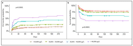 Probability of ICU transfer (a) and survival probability (b) according to total serum ferritin levels.