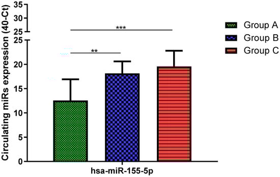 Serum levels of hsa-miR-155-5p in HNW (Group A), MANW (Group B) and HNAO (Group C). Results were shown as means ± SD. The statistical tests used in these analyses were one-way analysis of variance using Kruskal–Wallis test followed by Dunn’s Multiple Comparison Test. ** p < 0.01, *** p < 0.001.