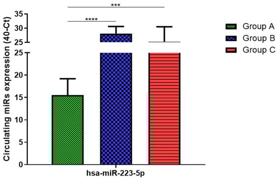 Serum levels of hsa-miR-223-5p in HNW (Group A), MANW (Group B) and HNAO (Group C). Results were shown as means ± SD. The statistical tests used in these analyses were one-way analysis of variance using Kruskal–Wallis test followed by Dunn’s Multiple Comparison Test. *** p < 0.001, **** p < 0.0001.