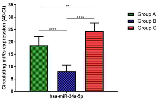 Serum levels of hsa-miR-34a-5p in HNW (Group A), MANW (Group B) and HNAO (Group C). Results were shown as means ± SD. The statistical tests used in these analyses were one-way analysis of variance using Kruskal–Wallis test followed by Dunn’s Multiple Comparison Test. ** p < 0.01, **** p < 0.0001.