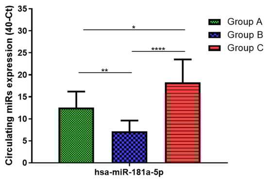 Serum levels of hsa-miR-181a-5p in HNW (Group A), MANW (Group B) and HNAO (Group C). Results were shown as means ± SD. The statistical tests used in these analyses were one-way analysis of variance using Kruskal–Wallis test followed by Dunn’s Multiple Comparison Test. * p < 0.05, ** p < 0.01, **** p < 0.0001.