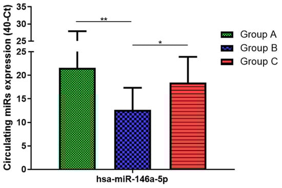 Serum levels of hsa-miR-146a-5p in HNW (Group A), MANW (Group B) and HNAO (Group C). Results were shown as means ± SD. The statistical tests used in these analyses were one-way analysis of variance using Kruskal–Wallis test followed by Dunn’s Multiple Comparison Test. * p < 0.05, ** p < 0.01.
