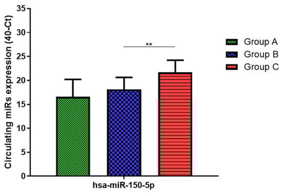 Serum levels of hsa-miR-150-5p in HNW (Group A), MANW (Group B) and HNAO (Group C). Results were shown as means ± SD. The statistical tests used in these analyses were one-way analysis of variance using Kruskal–Wallis test followed by Dunn’s Multiple Comparison Test. ** p < 0.01.
