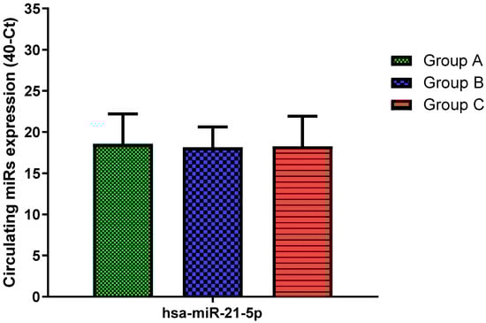 Serum levels of hsa-miR-21-5p in HNW (Group A), MANW (Group B) and HNAO (Group C). Results were shown as means ± SD. The statistical tests used in these analyses were one-way analysis of variance using Kruskal–Wallis test followed by Dunn’s Multiple Comparison Test.