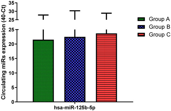 Serum levels of hsa-miR-125b-5p in HNW (Group A), MANW (Group B) and HNAO (Group C). Results were shown as means ± SD. The statistical tests used in these analyses were one-way analysis of variance using Kruskal–Wallis test followed by Dunn’s Multiple Comparison Test.