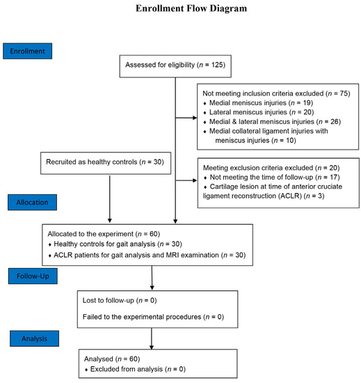 - Teng, H.-L.; Wu, D.; Su, F.; Pedoia, V.; Souza, R.B.; Ma, C.B.; Li, X. Gait Characteristics Associated with a Greater Increase in Medial Knee Cartilage T1ρ and T2 Relaxation Times in Patients Undergoing Anterior Cruciate Ligament Reconstruction. Am. J. Sports Med. 2017, 45, 3262–3271. [Google Scholar] [CrossRef]