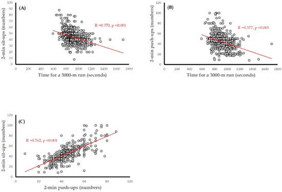 Scatterplots for the correlation between (A) 2-min sit-up numbers and time for a 3000-m run test, (B) 2-min push-up numbers and time for a 3000-m run test, and (C) 2-min sit-up numbers and 2-min push-up numbers.