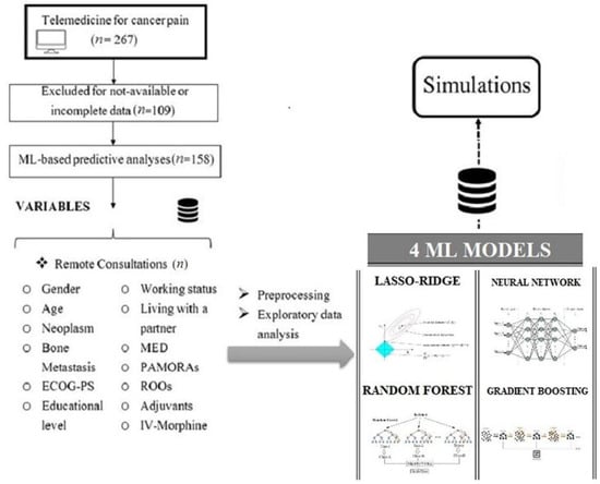 In a recent cross-sectional investigation, we proposed a model of care and evaluated adherence to the telemedicine pathway []. This “hybrid” model provides for scheduled remote visits, but the patient can require other consultations. Additionally, in-person access is provided for emergencies or for diagnostic or clinical aims. For each patient, the number of telemedicine visits can vary depending on an unspecified number of reasons, and we have noticed that some patients required a greater number of remote consultations. On these premises, the purpose of this study is the development of data-driven predictive models for identifying those patients who may require more remote consultations. In the context of precision medicine for cancer pain management, we implemented ML algorithms to better customize treatment strategies. As pieces of evidence are needed to establish the most appropriate telemedicine pathways, the recognition of those patients who require a greater number of remote visits can stimulate the planning of ad hoc processes for managing multiple care needs and calibrating resource allocation.