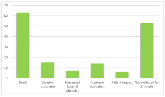 The reasons for interruption of the telemedicine pathway (dropouts) were the patient’s death (n = 63, 39.9%), the need for an invasive procedure (n = 15, 9.5%) or an in-person clinical assessment (n = 14, 8.9%). Six patients (3.8%) requested an in-person visit. Unplanned hospital admissions occurred in seven patients (4.4%). About a third of the patients (n = 53, 33.5%) were not evaluated (in person or remotely) for at least two months. These patients were contacted (email and telephone), and about half (n = 28) did not provide an answer; the remainder (n = 25) said they did not need further visits for cancer pain (Figure 2).
