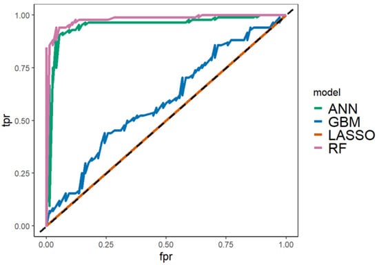 The area under the receiver operating characteristic (ROC) curve (AUC) of the considered models. False-positive rate (fpr) and true-negative rate (tpr) were considered. The plot shows the ROC curves calculated for each classifier over the entire dataset. RF and NN offer the best performance. Abbreviations: LASSO, LASSO–RIDGE regression; GBM, gradient boosting machine; ANN, artificial neural network; RF, random forest.