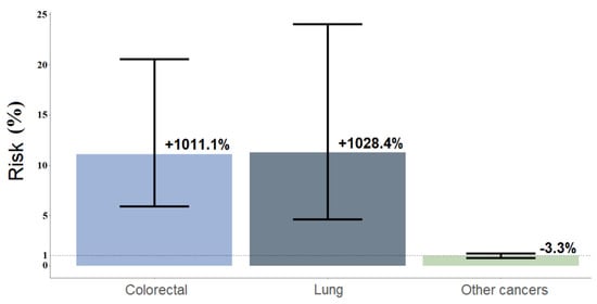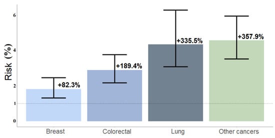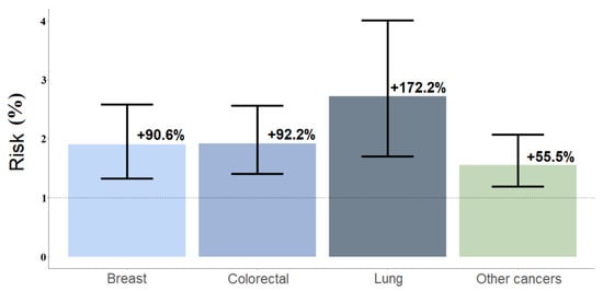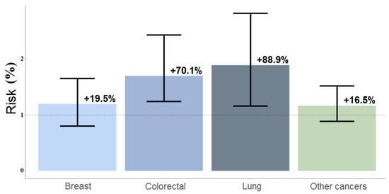 Condition 4: An overall higher risk of having multiple telemedicine visits was found for young cancer patients than for male cancer patients, with SORs of +88.9% (95%CI = +16%, +182%) for lung cancer; +70.1% (95%CI = +24.1%, +143.3%) for colorectal cancer; and +16.5% (95%CI = −0.9%, +51.9%) for other cancers. Compared with older patients, for young female breast cancer patients, no significant risk was found (+19.5%, 95%CI = −20%, +65.2%) (Figure 7).