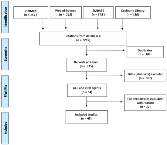 The initial electronic search turned out 1219 results. Titles and abstracts derived from the investigation were independently screened by three authors (AR, FF, GPDF) based on the listed criteria. Comparing the labels of the initial 1219 results, 304 were duplicates, and 861 were eliminated after having screened the titles based on the listed exclusion criteria. Then, 54 abstracts were analyzed; full-text articles were obtained for all titles agreed upon, and disagreements were resolved by discussion. A total of 11 studies were excluded (1 full-text article was not available; 3 were not related to OLP but systemic LP affecting the skin and mucous membranes, but it was not specified if any oral lesions were tested; 1 was a theoretical study; and 6 did not meet the requirements for inclusion on closer reading). Finally, 43 studies were included in the present review. The flowchart in Figure 1 explains the steps made during the selection process. We summarized and schematized the included studies in two different tables (Table 2 and Table 3).