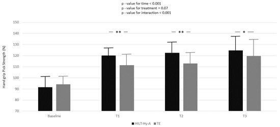 Handgrip peak strength variation according to time and treatment; black box represents high-intensity laser therapy plus hyaluronic acid (HILT + Hy-A) group, whereas grey box represents therapeutic exercise (TE). Results for the linear mixed model analysis (p-values for time, treatment, and interaction of time for treatment); Bonferroni adjustment for multiple comparisons were also applied between follow-ups of study compared to baseline; *: p < 0.05; **: p < 0.001.