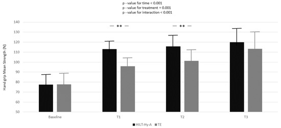 Handgrip mean strength variation according to time and treatment; black box represents high-intensity laser therapy plus hyaluronic acid (HILT+Hy-A) group, whereas grey box represents therapeutic exercise (TE). Results for the linear mixed model analysis (p-values for time, treatment, and interaction for time for treatment). Bonferroni adjustment for multiple comparisons applied between follow-ups of the study compared to baseline; **: p < 0.001.