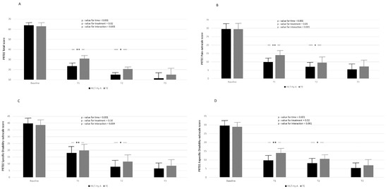 Report the PRTEE total score (A), the pain subscale score (B), the specific disabil-ity score (C), and the usual activity score (D). according to time and treatment; black box represents high-intensity laser therapy plus hyaluronic acid (HILT + Hy-A) group, whereas grey box represents therapeutic exercise (TE). Results for linear mixed model analysis (p-value for time, treatment, and interaction of time for reatment). Bonferroni adjustment for multiple comparisons applied between follow-ups of the study compared to baseline; *: p < 0.05, **: p < 0.001.