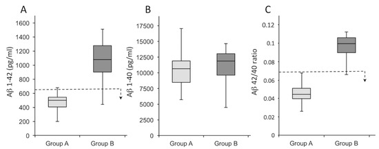 Subdivision of patients into two groups regarding the expression of Aβ 1–42 (A) and Aβ 1–40 (B), and the Aβ 42/40 ratio (C). The dotted line represents the threshold for a subject to be considered AD or non-AD; the arrow indicates the direction of values for which the subjects are affected by AD. Group A is depicted in light gray, and Group B is depicted in dark gray.