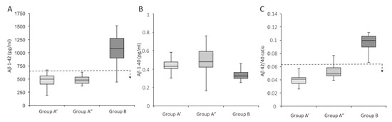 Table 3 shows the average values of the different variables, together with their p-value (one-way ANOVA), for a comparison of Groups A’, A”, and B. In support of these data, Figure S3 show the values measured for all analyzed subjects (Groups A’, A”, and B) in terms of Aβ 1–42 (Figure S3a), Aβ 1–40 (Figure S3b), and the Aβ 42/40 ratio (Figure S3c).