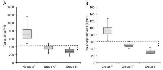 Table 4 shows the average values of the different variables, together with their p-value (one-way ANOVA), for a comparison of Groups A’, A”, and B. In support, Figure S4 show the values measured for all subjects analyzed in terms of Tau-total (Figure S4a and Tau-phosphorylated (Figure S4b).