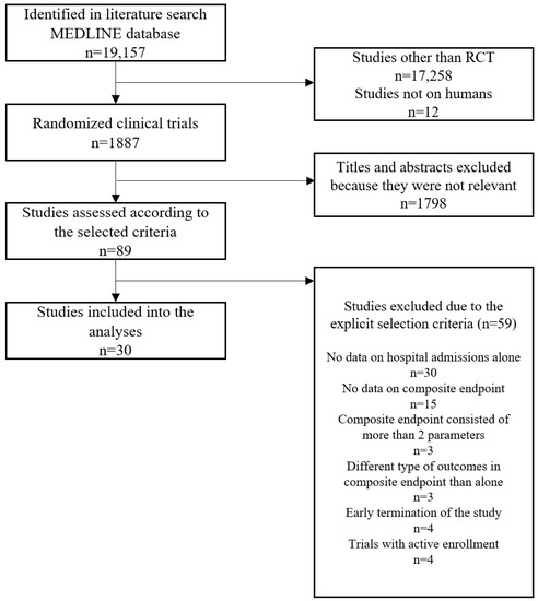 The analysis excluded trials with follow-up shorter than 30 days or trials discontinued early or suspended or with more than two parameters in the composite endpoint (in such a case, there is no possibility of calculating the rate of deaths without a rehospitalization event), or trials enrolling patients with asymptomatic left ventricular dysfunction instead of HF.