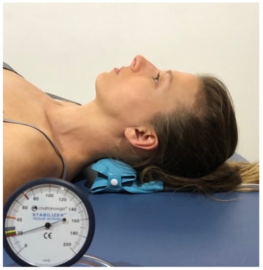 CCFT evaluates deep neck flexor (longus colli, longus capitis) activation and low-load endurance capacity. The test was performed in supine position, as previously described by Jull et al. [8]. Patients were asked to attempt five progressives inner range contractions guided by feedback from a pressure sensor placed behind their neck and pre-inflated to a baseline of 20 mmHg (Chattanooga Stabilizer Group Inc., Hixson, TN, USA) (Figure 1). Participants were asked to nod the chin (as if saying “yes”) to reach each 2 mmHg incremental target from 22 mmHg to 30 mmHg, and to hold the position for 10 s. Craniocervical flexion for each increment was repeated 3 times. The test was stopped if the patient was unable to hold the position, if they performed a retraction action, or if holding the position was jerky. The pressure level at which the participant could control the contraction for three repetitions was documented for analysis. CCFT has excellent intrarater reliability with an intra correlation class coefficient (ICC) of 0.98 and interval of confidence of 95% (95%IC) ranged between 0.95 and 0.90 [36], with good validity [37,38], with standard error of measurement less than 1.7 mmHg [38].