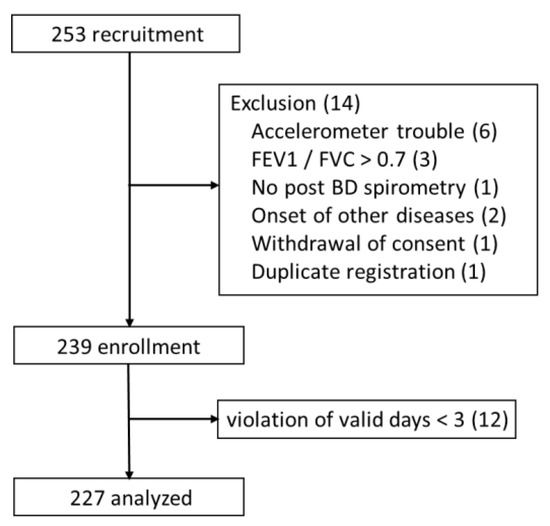 Physical activity is decreased in patients with chronic obstructive pulmonary disease (COPD) compared to healthy controls [1,2], and decreased physical activity leads to a poor prognosis [3,4]. Physical inactivity is typically associated with all-cause mortality in patients with COPD [5].