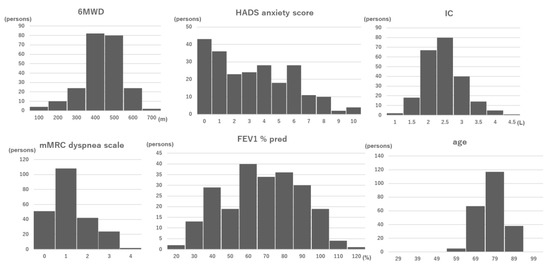 Histograms of the indicators. Abbreviations: 6MWD, 6 min walking distance; HADS, Hospital Anxiety and Depression Scale; IC, inspiratory capacity; mMRC, modified British Medical Research Council; FEV1 %pred, forced expiratory volume in one second % of predicted.