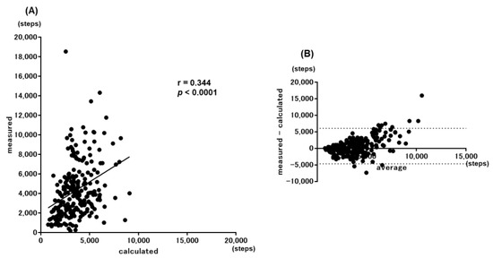 When the step counts calculated by the simple prediction equation for all 227 participants were compared with the measured step counts, a significant correlation was obtained among them (r = 0.344, p < 0.0001) (Figure 3A). However, when both step counts were examined with the Bland–Altman plots, there was no fixed bias, although a proportional bias was noted (Figure 3B). According to Nakanishi’s report, the values calculated by the simple prediction equation were reproducible with the values measured by the Bland–Altman plots in patients whose measured step count was <6500 steps [19]. In the current population, the calculated values by the simple prediction were also found to be reproducible with the measured values in patients with a measured step count <6500 (Figure 4). Furthermore, reproducibility was obtained in patients with a measured step count <7500.