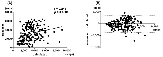 Statistical analyses were performed using the GraphPad Prism 7 software program (GraphPad Software, San Diego, CA, USA). Correlation coefficients and Bland–Altman plots were used to compare the measured and calculated step counts. The level of statistical significance was considered to be p < 0.05.