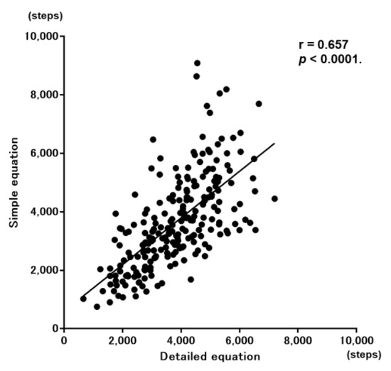 Correlation between the step count calculated by the simple prediction equation and that calculated by the detailed prediction equation.