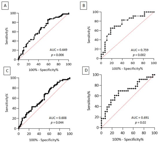 ROC curve analysis was therefore employed to detect the utility of these immunological measures in discriminating PD from HC, finding for lymphocyte count an AUC value = 0.649 (95% CI 0.0549–0.748, p = 0.006) and for NLR an AUC value = 0.608 (95% CI 0.506–0.711, p = 0.044) (see Figure 1 panel A and C). Regarding lymphocyte count, an optimal cut-off value ≤ 1.915 × 103/microL had 69% sensitivity (95% CI 56.20–79.38%) and 55.2% specificity (95% CI 42.45–67.25%), whereas an optimal cut-off for NLR ≥ 2.065 showed a sensitivity of 69% (95% CI 56.20–79.38%) and a specificity of 48.3% (95% CI 35.93–60.84%), see Table 2.