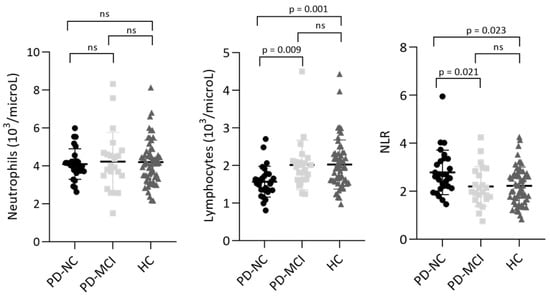 Therefore, the present study aimed to elucidate whether (i) lymphocyte count and NLR can discriminate PD patients from HC; (ii) they may represent feasible prognostic biomarkers of mild cognitive impairment (MCI) in PD.