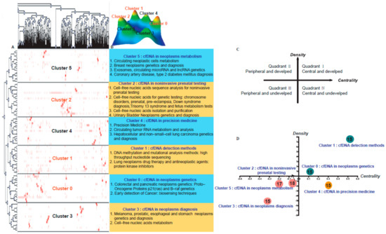 According to the biclustering analysis of MeSH terms/MeSH subheadings from the PubMed database, the main MeSH terms/MeSH subheadings of cfDNA were assigned to the four quadrants in the strategic diagram (Figure 2C,D).