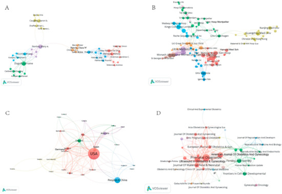 In the third quadrant of the strategic diagram, we conducted VOSviewer analysis and research on topics related to obstetrics and gynecology. VOSviewer enables visualization and displays cluster analysis results. It can support multiple types of bibliometric research. To analyze the authors, institutions, countries, journals, and keywords of the literature and build a visual map of keywords, we used VOSviewer version 1.6.13.
