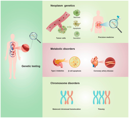 The main clinical applications of cfDNA genetic testing, including neoplasm genetics, metabolic disorders, and chromosomal disorders.