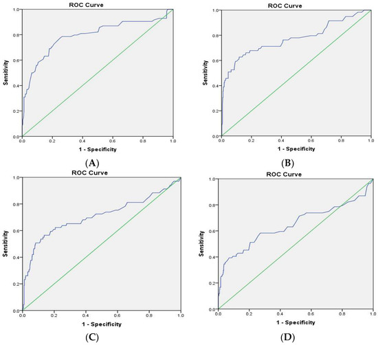 ROC curves were generated to compute the area under the ROC (AUROC), the best threshold, and the corresponding sensitivity and specificity for all four glycemic indicators on SSI. The AUROC results indicated that preoperative HbA1c (AUROC = 0.793; 95% CI: 0.730–0.856) (Figure 1A), preoperative blood glucose (AUROC = 0.773; 95% CI: 0.694–0.851) (Figure 1B), and postoperative blood glucose (AUROC = 0.709; 95% CI: 0.629–0.790) were highly predictive (AUROC > 0.7) of SSI (Figure 1C), whereas postoperative HbA1c (Figure 1D) (AUROC = 0.648; 95% CI: 0.570–0.726) was moderately predictive. With regard to the HbA1c threshold, a preoperative HbA1c of less than 7.850 predicted the absence of SSI with 78.6% sensitivity and 73.6% specificity (Figure 1A), and a postoperative HbA1c threshold of less than 6.650 did so with 73.8% sensitivity and 43.3% specificity (Figure 1D). For blood glucose, a preoperative blood glucose level of less than 130.50 predicted the absence of SSI with 76.3% sensitivity and 58.9% specificity (Figure 1B), and a postoperative blood glucose threshold of less than 148.5 did so with 65.2% sensitivity and 72.1% specificity (Figure 1C).
